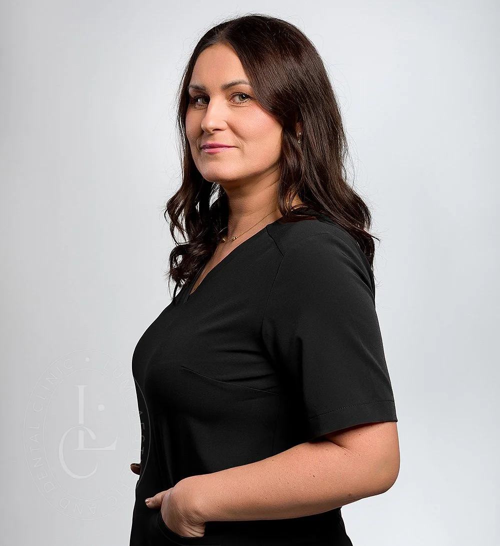 Ukończyła szkołę w zawodzie higienistki stomatologicznej i stale rozwija swoje kompetencje, uczestnicząc w kursach oraz szkoleniach branżowych.